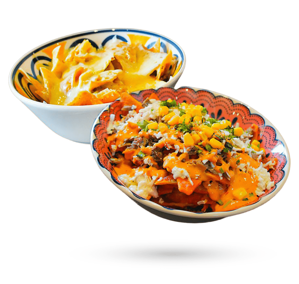 Totopos, salsas, crema, queso y toppings a tu elección, si buscas creatividad también la podemos anexar.